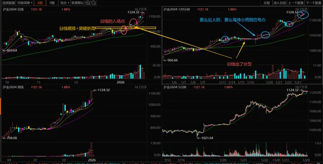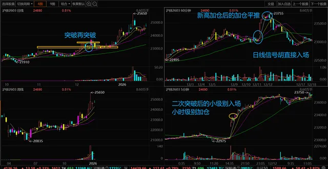 小周期入场的好处是止损足够小,盈亏比极佳——用一根小火柴的风险,去点燃一整片森林的利润。小周期建立底仓,入场周期加仓,持仓周期第三次加仓,建仓完成。