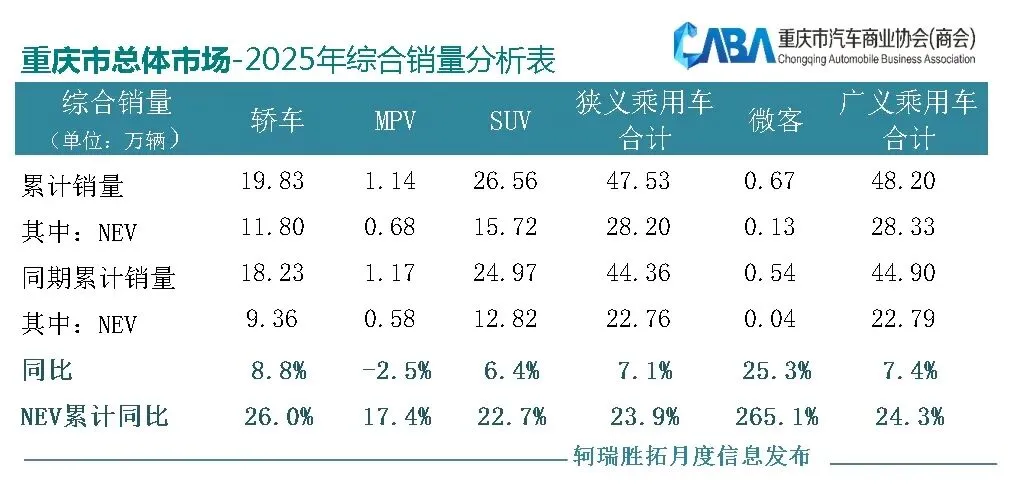 从数据来看:今年1-12月,重庆广义乘用车累计销售为48.2万辆,同比增长7.35%。其中燃油车销量为19.87万辆,同比下降10.1%;新能源乘用车销量为28.33万辆,同比增长24.3%。具体来看,2025年重庆市场轿车累计销量19.83万辆,同比增长8.8%;MPV累计销量1.14万辆,同比下滑2.5%;SUV累计销量26.56万辆,同比增长6.4%。