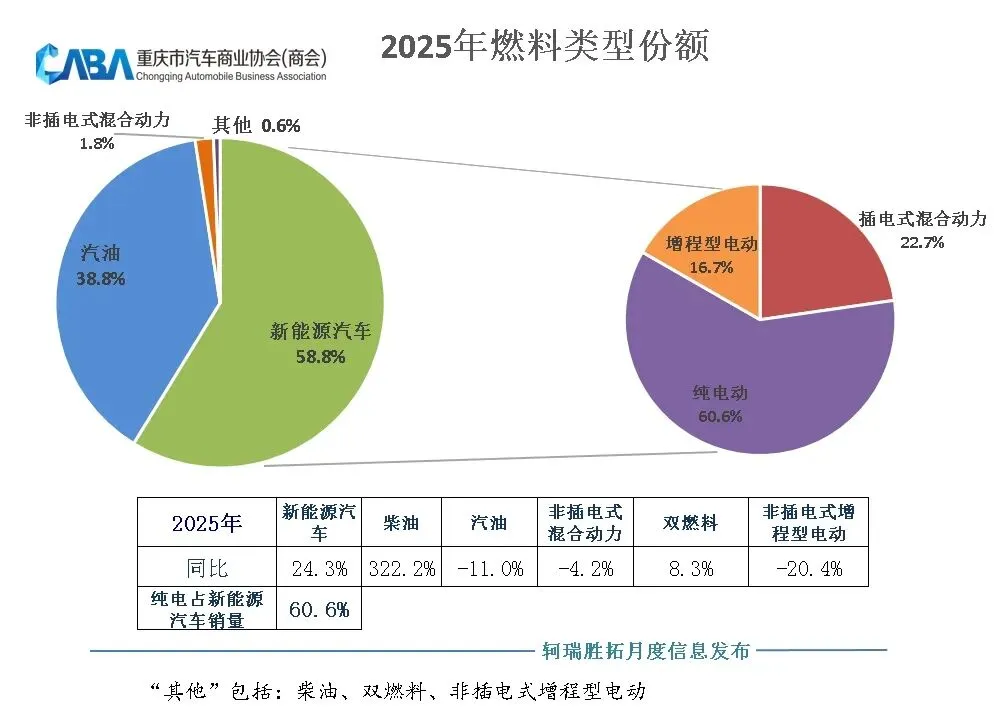 从2025年销售车型的燃料类型来看,重庆市场燃油车销量占比为38.8%,相比上年进一步下滑。具体来看,新能源汽车销量占比达到58.8%,其中,纯电车型占比为60.6%。