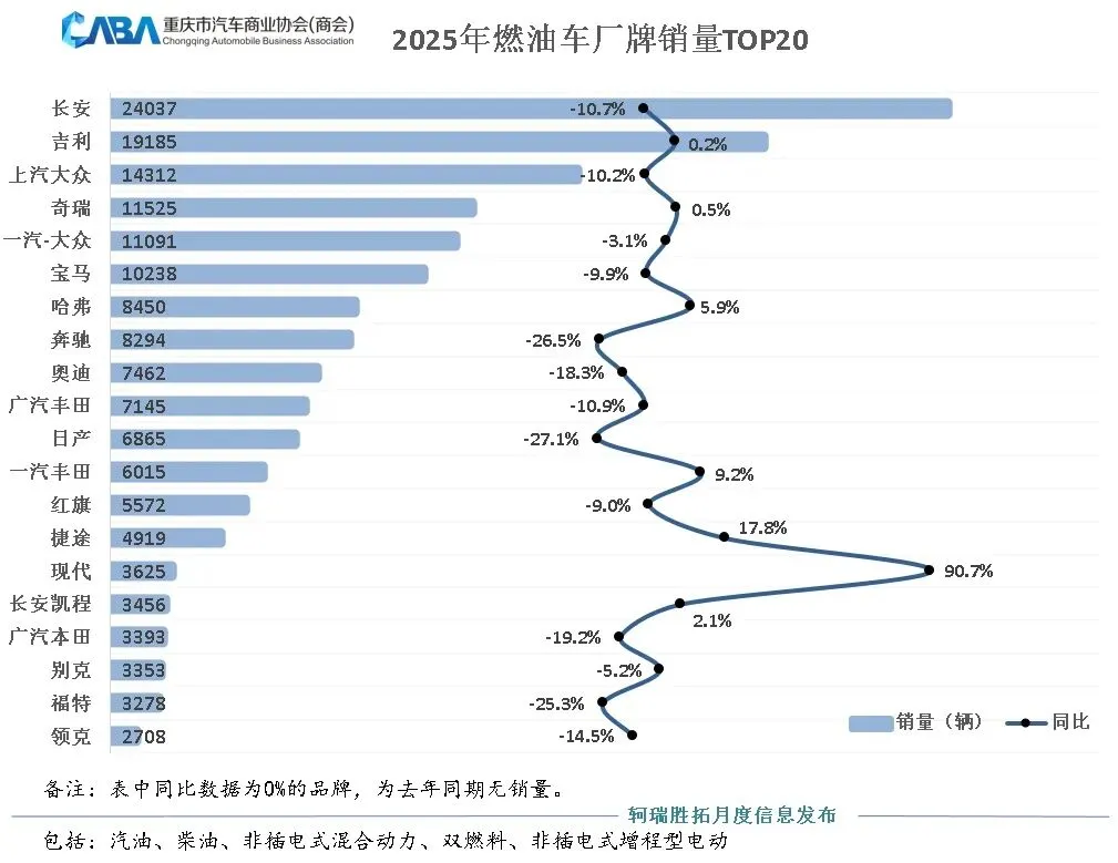 让人感到意外的是,2025年现代汽车依靠价格优势在重庆市场实现逆势增长,累计销量0.36万辆,同比增长90.7%,为燃油车市场带来一丝惊喜。另外,一汽丰田销量0.6万辆,同比增长9.2%,其表现也在状态。