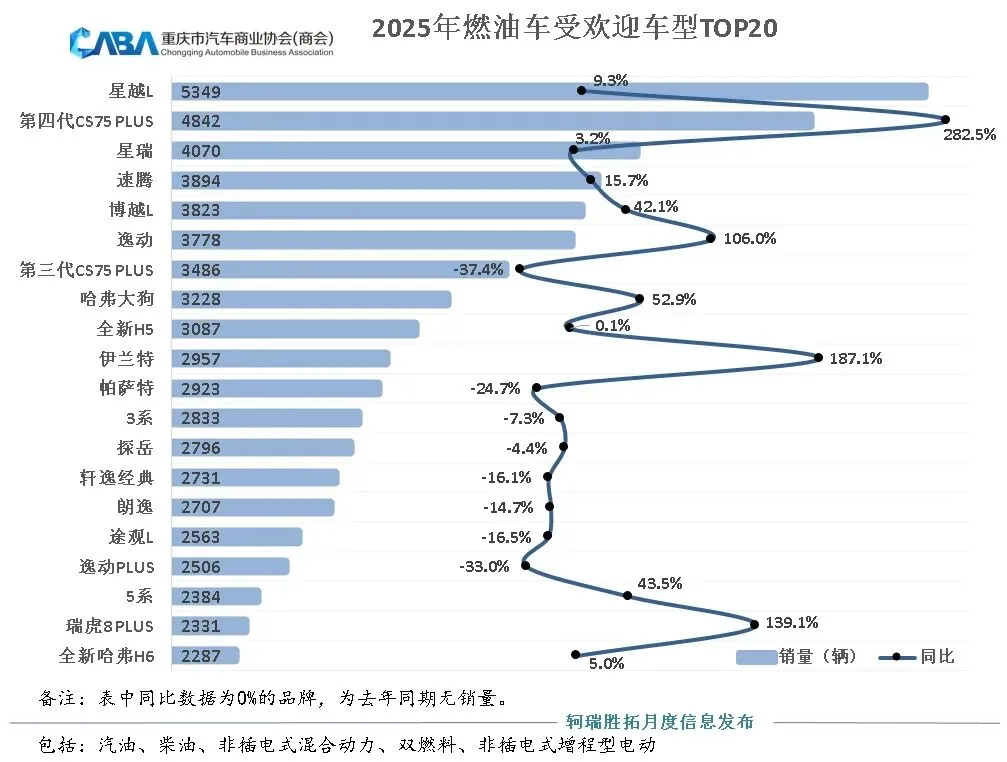 2025年重庆燃油车受欢迎车型TOP20中,前三排名被星越L、第四代CS75PLUS、星瑞获得。其中,第四代CS75PLUS同比增长为282.5%,从这能看得出重庆消费者对于本土品牌还是情有独钟的。