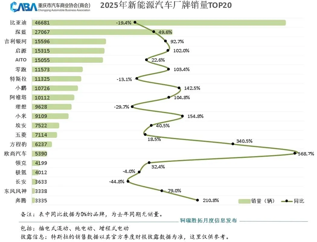在重庆2025年新能源汽车厂牌销量TOP20中,尽管比亚迪销量超4.66万辆,坐稳第一,但同比下滑19.4%的数据,让厂家压力不小。