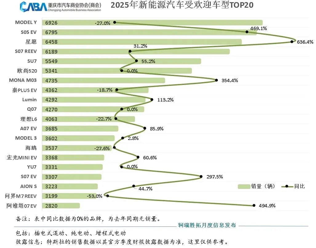过去的2025年,重庆新能源市场上演着一出“你方唱罢我登场”的大戏,各车型之间的竞争异常热烈。从2025年新能源汽车受欢迎车型TOP20来看,MODEL Y、深蓝S05 EV、吉利星愿位居排名前三。