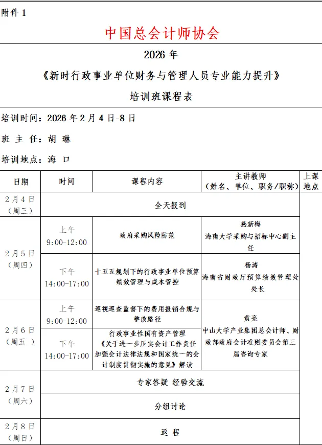 在行政事业单位财务领域改革不断深化的当下,专业能力的提升成为从业者突破职业瓶颈的关键。2026 年 2 月 4 日 - 8 日,中国总会计师协会 “新时代行政事业单位财务与管理人员专业能力提升” 培训班将在海口盛大启幕,