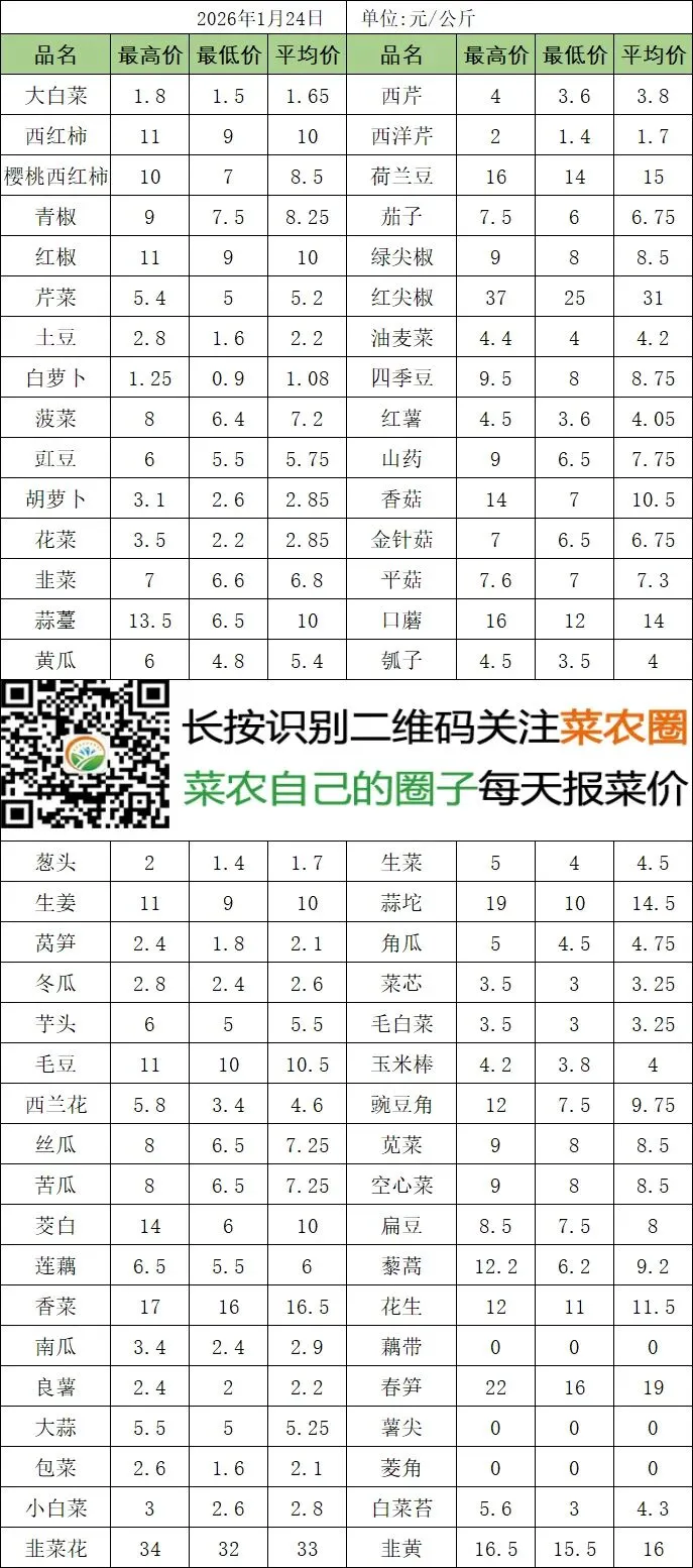 >2026年1月24日武汉白沙洲蔬菜价格 武汉每天蔬菜价格表