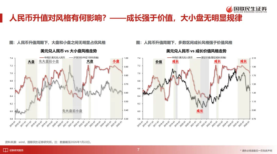 在人民币升值周期内,无论人民币是否为被动升值,全A指数普遍呈现上行趋势。行业上,人民币升值对于多数行业股价均有正向影响,其中钢铁、房地产、轻工和交运等行业靠前。风格上,多数区间成长风格强于价值风格,大盘和小盘之间无明显占优风格。