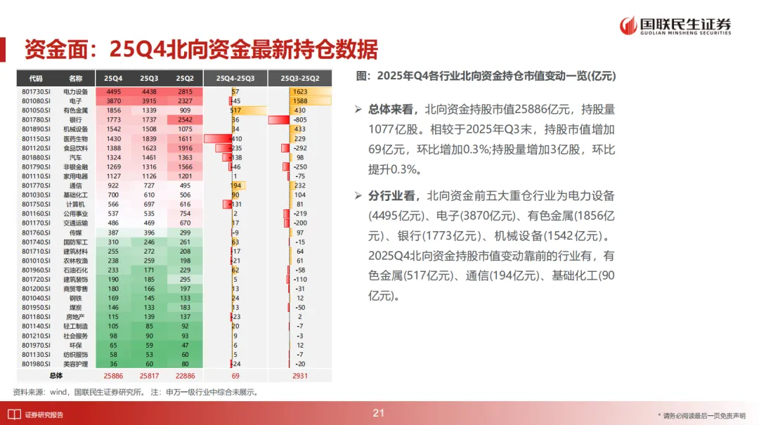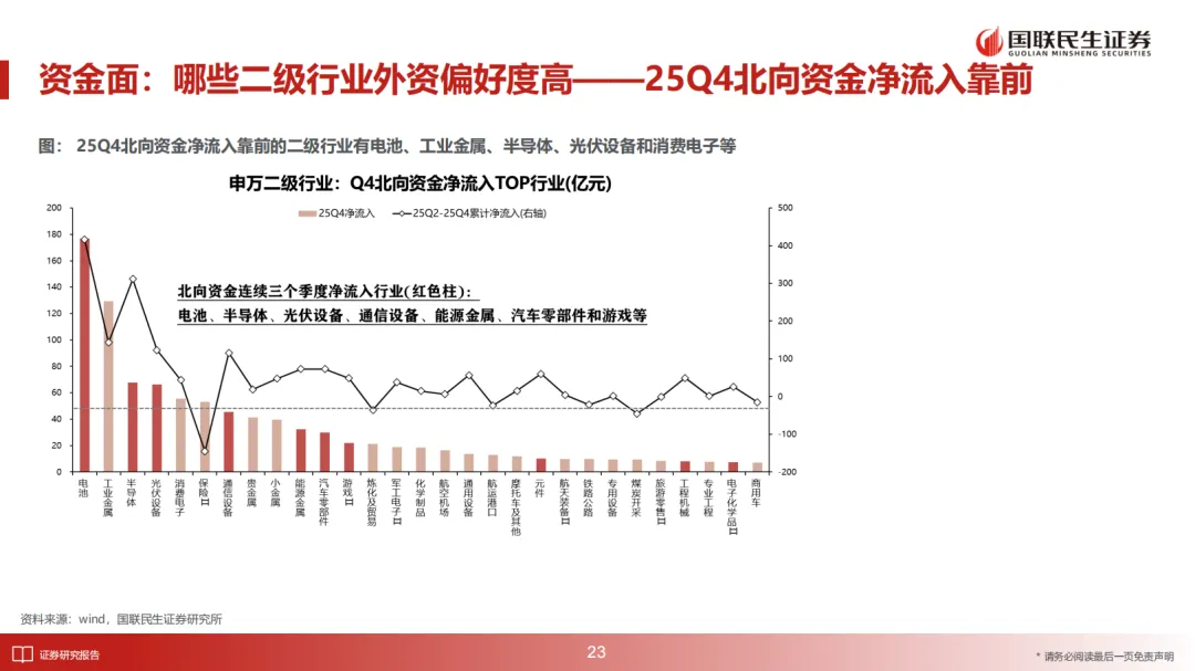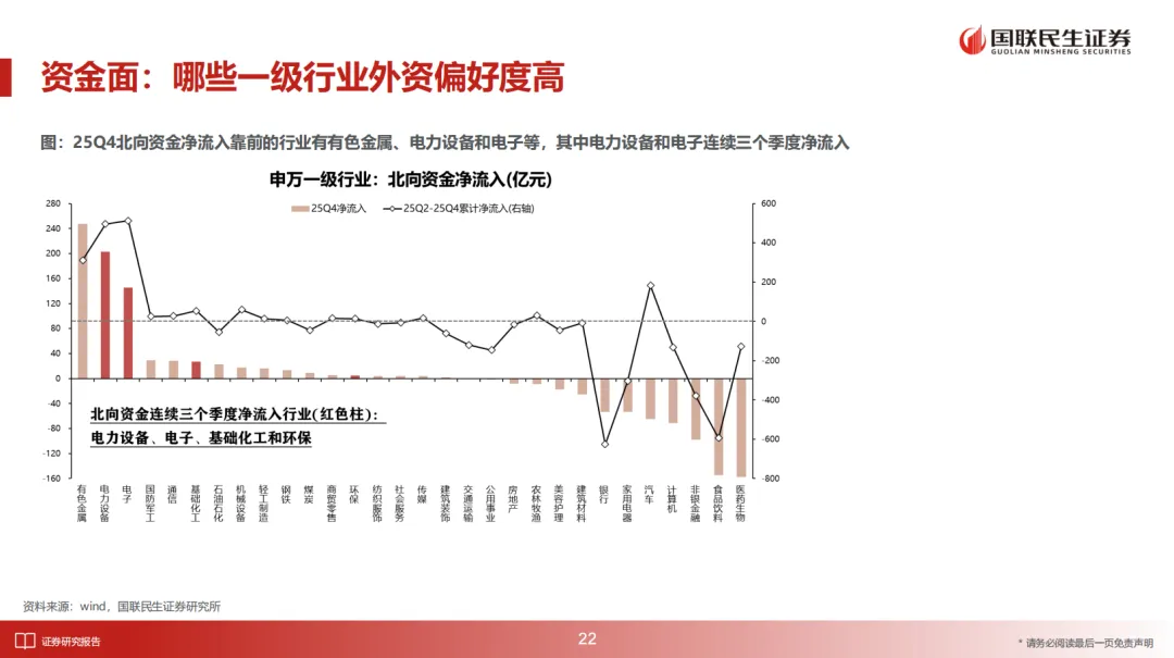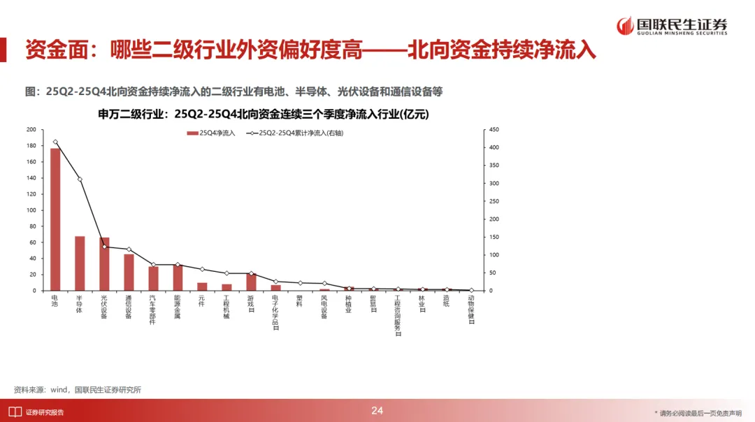 历史数据来看,人民币升值周期下,北向资金流入明显加速。在人民币升值周期内,行业北向资金净流入和行业区间涨跌幅相关性较高。基于北向资金当下的投资偏好特征,一级行业中,有色金属、电力设备和电子等行业25Q4净流入靠前,其中电力设备和电子连续三个季度净流入。二级行业中,电池、工业金属、半导体、光伏设备和消费电子等行业25Q4净流入靠前,电池、半导体、光伏设备和通信设备等行业持续三个季度净流入。