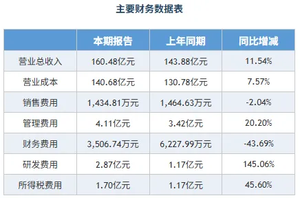 (1)营业总收入本期为160.48亿元,同比小幅增长11.54%;