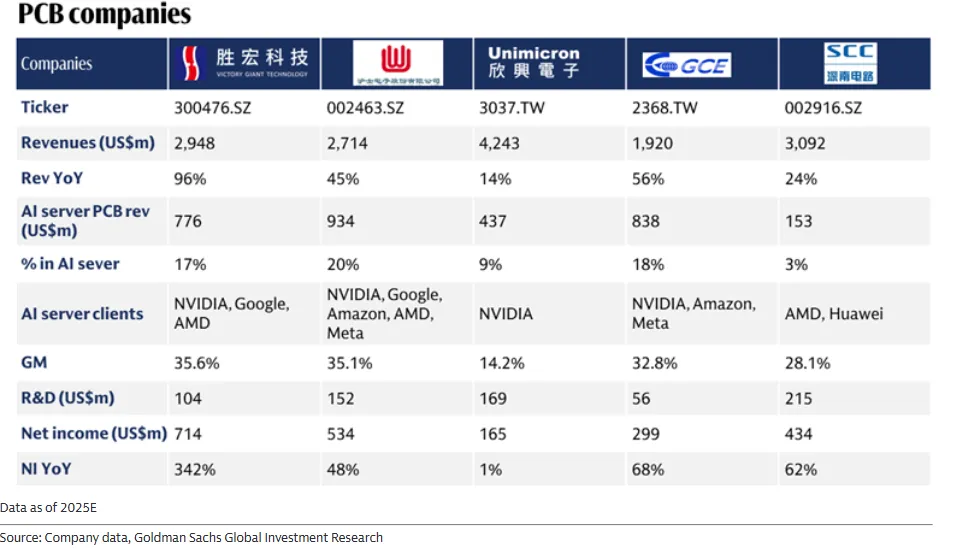 我们预计未来几年收入将保持强劲增长,核心驱动因素包括:人工智能服务器持续扩产,单机柜算力提升及高速连接(如 800G/1.6T 交换机)普及;高层数 PCB 和高端材料应用推高单位价值;PCB 在人工智能服务器中替代铜缆连接(装配更便捷),使用量增加;中国供应商加大研发与产能投入,客户群体从 GPU 人工智能服务器客户拓展至 ASIC 人工智能服务器客户,本土客户占比提升。