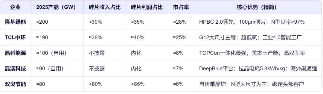 隆基、中环:硅片外售+自用并重,硅片是独立利润中心;晶科、晶澳:高度一体化,硅片主要用于自供,不单独核算;双良节能:纯专业化硅片供应商,利润几乎全部来自硅片。技术共性: