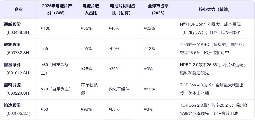 均全面转向N型大尺寸(182/210mm),推进130μm→110μm→100μm 薄片化,并强化低碳制造(绿电、低电耗)。二、中游:电池片 + 组件(制造与终端核心)