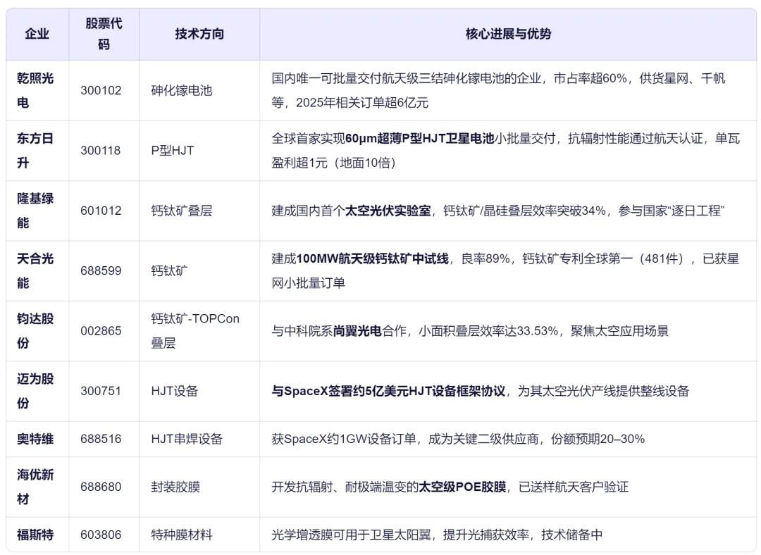 1)钧达股份(002865.SZ):专注高效TOPCon电池片,几乎全部外售。海外收入占比:2025年约 35–40%,主要销往东南亚(供当地组件厂)、印度、土耳其。正加速拓展欧洲、中东客户,预计2026年海外占比将超50%。动因:海外本土组件产能扩张快,但电池片自供不足,依赖中国进口。2)爱旭股份(600732.SH):全球唯一量产ABC(背接触)电池的企业,主打高端市场。海外收入占比:2025年已超 50%,欧洲是最大市场(高溢价接受度强)。优势:ABC组件效率达26.5%,在分布式屋顶项目中具备不可替代性,出口单价比国内高15%以上。海外收入占比:约75–80%(2025年),连续多年全球出货第一。策略:通过马来西亚、越南、美国本土工厂规避贸易壁垒,海外毛利率比国内高5–8个百分点特点:HPBC组件主攻欧美高端分布式市场,品牌溢价显著。挑战:美国市场受UFLPA影响,正通过中东、东南亚产能迂回出货。海外收入占比:超60%,欧美渠道深厚,长期绑定大型开发商。优势:产品可靠性获国际认证,海外订单多为长协+溢价,抗价格战能力强。海外收入占比:约55–60%,欧洲、拉美、澳洲为主要增长点。特色:以“Vertex N型组件+储能”打包方案出海,提升单客户价值。四、太空光伏