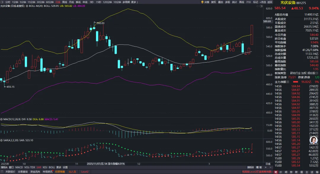 昨日(2026年1月23日),A股光伏板块大涨,核心原因是埃隆·马斯克(Elon Musk)关于“太空光伏”的重磅表态,叠加了行业内部的产能出清和资金高低切换这三大因素的共振。1月22日(周四),马斯克在达沃斯论坛上宣布,SpaceX和特斯拉计划在未来三年内,每年各建设100GW的太阳能产能。应用场景: 这些产能不仅用于地面,更关键的是用于太空AI卫星和地面数据中心供电。市场反应: 这一消息直接打开了市场对光伏行业的新想象空间——太空光伏。机构测算这可能是一个高达5000亿美元甚至万亿级别的新赛道。这不仅让原本低迷的光伏板块找到了全新的炒作逻辑,还带动了“商业航天+AI算力”的概念共振。太空光伏(Space-based Solar Power)虽尚未进入大规模商业化阶段,但受益于低轨卫星星座加速部署(如星链、中国“GW/千帆”计划)、AI算力上天趋势及马斯克等科技领袖推动,已从概念验证迈入小批量订单落地与技术预研并行的新阶段。在A股光伏板块中,并非所有企业都能受益,只有具备高效率、抗辐射、轻量化、柔性化等特殊技术积累的细分环节和企业,才真正切入这一高壁垒、高毛利赛道。核心需求:太空环境要求电池具备高转换效率(>30%)、强抗辐射能力、轻量化(降低发射成本)。砷化镓(GaAs):当前航天器主流,效率30–34%,但成本极高(约300–450元/瓦),适用于高轨/深空任务;P型HJT:超薄(60μm)、抗辐射、成本仅为砷化镓1/3,2026年起成为低轨卫星主力替代方案;钙钛矿/叠层电池:理论效率>33%,比功率达5–10 W/g(是传统刚性太阳翼3倍以上),被视为长期“终极方案”。五、技术走势分析