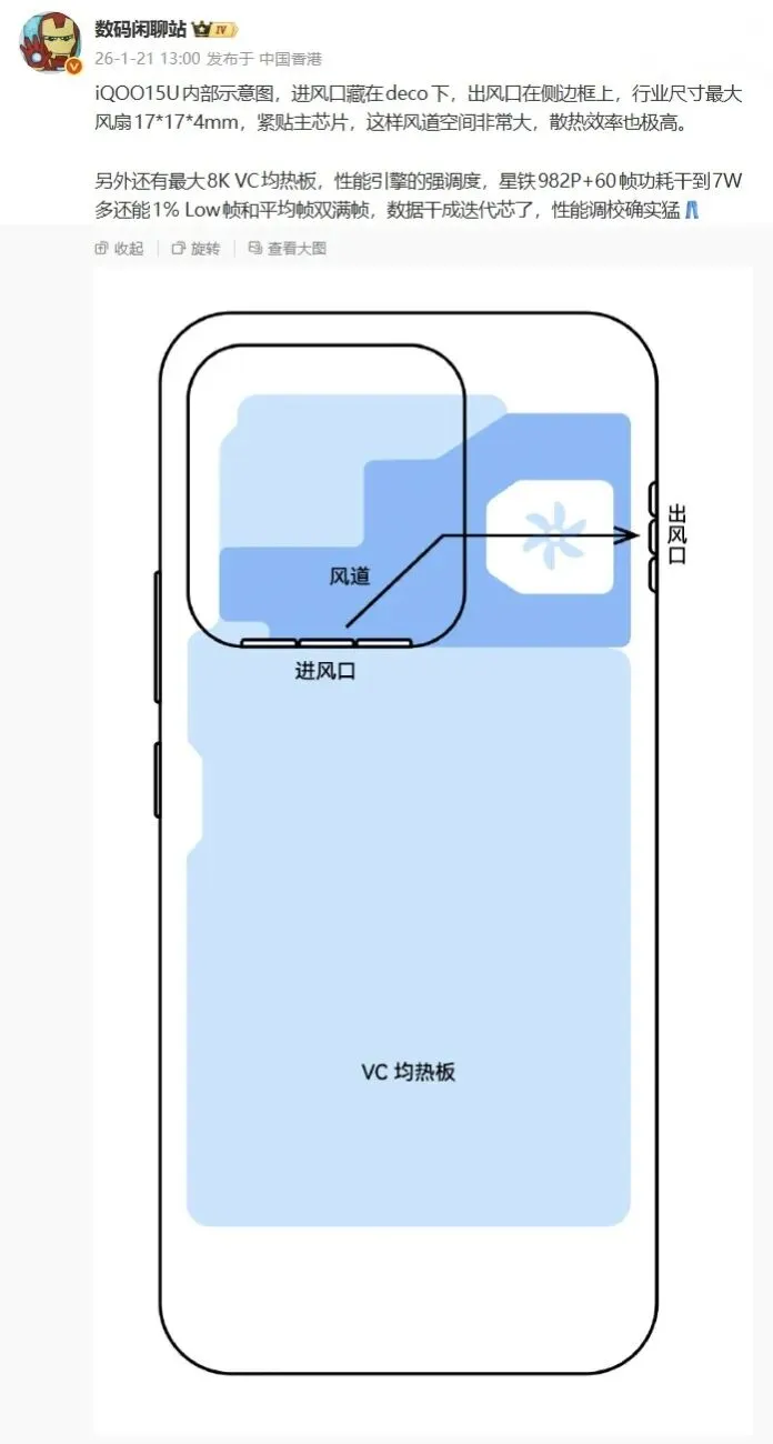 据官方及爆料信息,iQOO 15 Ultra致力于打造顶级游戏体验,搭载高通第五代骁龙8至尊版旗舰芯片,手机塞下了行业最大风扇 + 大面积独立风道根据曝光的内部示意图,其风扇尺寸达17174mm,号称“行业尺寸最大”,进风口巧妙隐藏在后摄模组下方,出风口位于侧边框,以提供极致的散热效率。