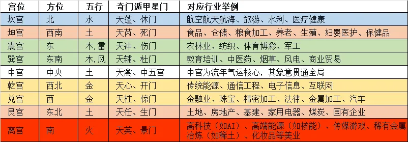 结合近年来的飞星轨迹,我们可以观察到鲜明的行业轮动线索。2020庚子年:左辅星(当运星)在乾宫,武曲星入巽宫,当年股市涨幅最大的是疫苗医药(巽宫),锂电池和光伏等传统能源(乾宫的先天八卦在离宫,代表传统能源)。2021辛丑年:左辅星(当运星)在兑宫,武曲星入中宫:电力设备,有色金属,汽车等兑宫行业表现较好。2022壬寅年:左辅星(当运星)在艮宫,武曲星入乾宫:2022年受内外因素的各种影响,A股市场整体下跌,防御性板块占优。煤炭板块(艮宫)受益于俄乌冲突等因素导致的全球能源价格上涨,成为全年表现最强的行业板块。2023癸卯年:八白左辅当运星在离宫,离宫为九紫星的本位宫,呼应九运AI浪潮初兴。光模块、AIGC与游戏成为年度热门概念。2024甲辰年:武曲星入艮宫。股市涨幅最大的是中特估(艮宫)。房地产白酒等八运传统行业,迎来一波显著反弹。2025乙巳年:武曲星入离宫,九紫当运星在震宫。高科技(人工智能)、高端能源(稀土,半导体,核聚变)等为全年主线。三、未来行业投资启示
