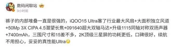日前,数码博主,再次明确曝出了一款新机的配置亮点,据其称,“裤子的内部堆叠一直是很强的,iQOO15 Ultra塞了行业最大风扇+大面积独立风道+50Mp 3X CIPA 4.5潜望长焦+091640超大双轴马达+升级1115同轴对称双扬声器+7400mAh,三围尺寸和15差不多,2K顶级三星屏的功耗更低,口碑很好,续航不用担心,妥妥的真性能Ultra”。