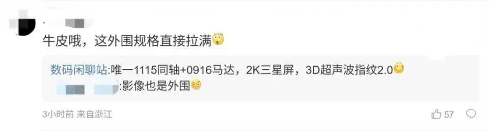 此外,在该条微博评论区,在与网友互动时,该博主还透露,该机“N79频段也补上了,后面各家3500以上机型都得有N79”。针对网友“牛皮哦,这外围规格直接拉满”的表述,该博主回应称,“唯一1115同轴+0916马达,2K三星屏,3D超声波指纹2.0”;针对网友提出的“其他家品牌有没有跟进一下”,该博主回复称,“风扇?有的”。