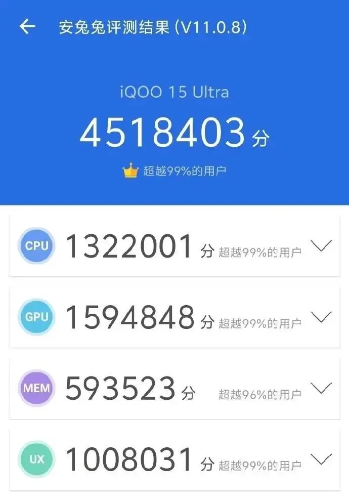 在性能方面 @戈蓝V 直接晒出了iQOO 15 Ultra在实验室中的跑分成绩,从公布的成绩看,已经突破了451分,将挑战行业最高跑分成绩。而据此前曝光的信息来看,该机将搭载高通第五代骁龙8至尊版处理器。更值得一提的是, @戈蓝V 还透露 这个跑分并非该机的最高成绩,该机还将有更高的性能表现,并称,“让大家所期待的下一代旗舰芯片的性能和体验提前来到。”