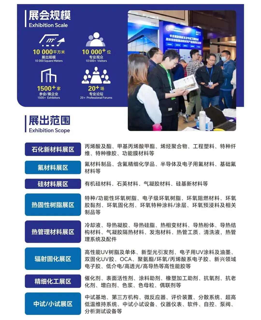 ACMIE2026展出范围广泛,同时配以高端论坛,涵盖辐射固化、电子胶、乙烯下游高端聚合物、特种工程塑料、丙烯酸及酯、甲基丙烯酸甲酯、半导体材料、氟材料、液冷、热管理材料、有机硅、高纯石英、气凝胶、表面活性剂等重点方向,参会规模预计3000人,参加企业1500家、展示面积10000平米。