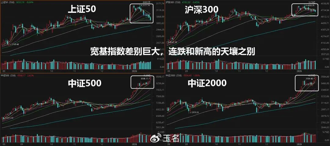 市场近期走势很神奇,外盘风声鹤唳,跳水的时候,我们是星线;特朗普撤回对八国关税,直接引发美股反弹,而我们还是星线,基本上不受影响。最近1周多时间,全A指数的空间就是1%左右;更神奇的是1.23日5次冲高,5次回落,明显是有精准控盘。这看上去平静,实则暗潮汹涌。一方面,上证50已经是9连跌了,而另一方面我们看到国家队最偏好的A500是要反复新高的,中证2000已经没调整,这个差距还是巨大的。