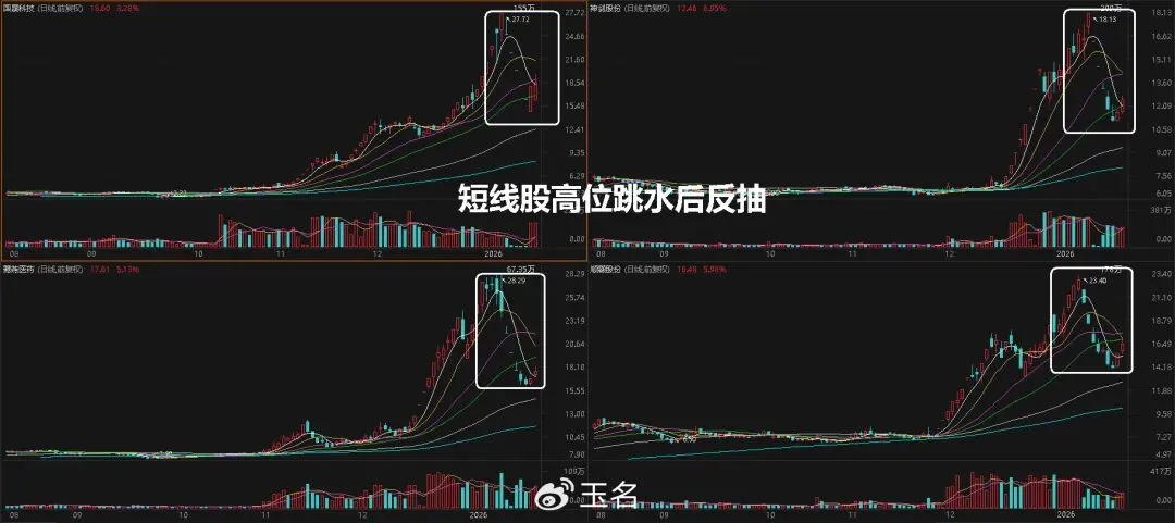 之前短线品种的国晟-科技、神剑-股份、鹭燕-医药、引力-传媒、航天-发展、顺灏-股份等一批股跌幅都是40-50%以上了。随后,我们也看到了反抽。尤其是如国晟-科技走出来了地天板,1月15日该股首次跌停后,连续6个一字跌停;直到1.22日的13:18开始打开跌停板,并直接涨停。这也是近期一个写照,再强的热点反弹一波都要调一调,跌得猛的品种也会有一个反抽,但关键的还是业绩报的证伪与支撑,是一个分水岭。