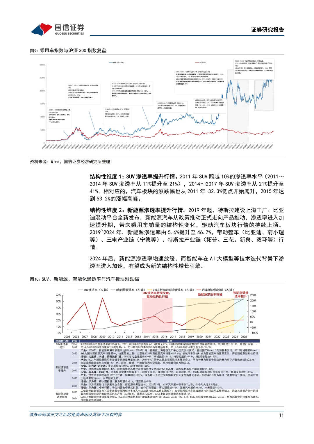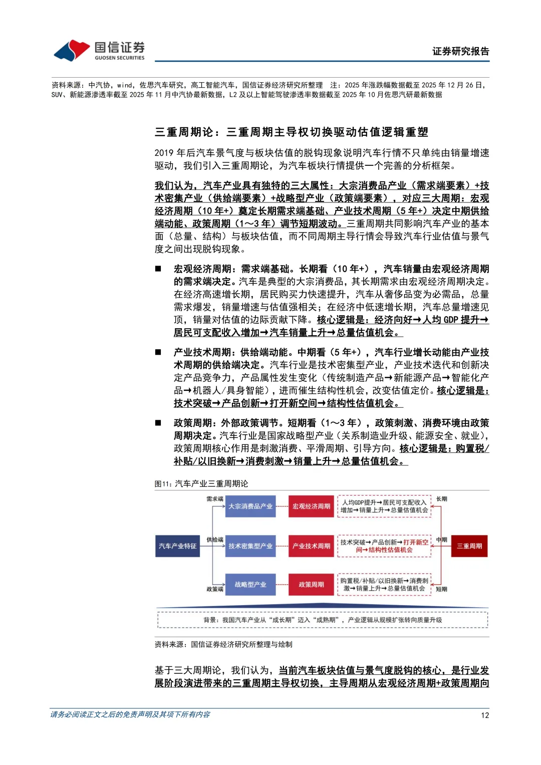 为何出现景气度和板块估值的脱钩?三重周期决定论。汽车产业具有三大属性:大宗消费品产业(需求端要素)+技术密集产业(供给端要素)+战略型产业(政策端要素),对应宏观经济周期(10年+)、产业技术周期(5年+)、政策周期(1~3年),共同影响汽车产业基本面(总量、结构)与板块估值。当前汽车板块估值与景气度的脱钩并非偶然的短期现象,而是我国汽车产业向成熟期阶段演进下,三重周期主导权切换的结果,主导周期从宏观经济周期+政策周期转向产业技术周期,使得结构性机会(SUV、新能源、智能化等)成为估值新动能,最终导致景气度与估值的相关性弱化。