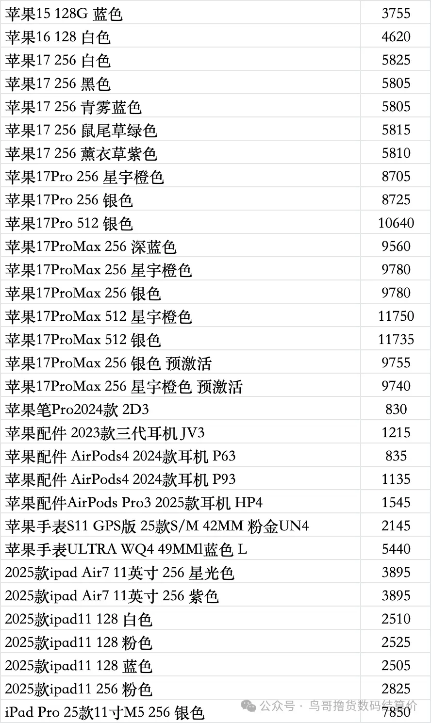 | 鸟哥收货iphone/ipad/手表系列结算价(前一天的结算价) |