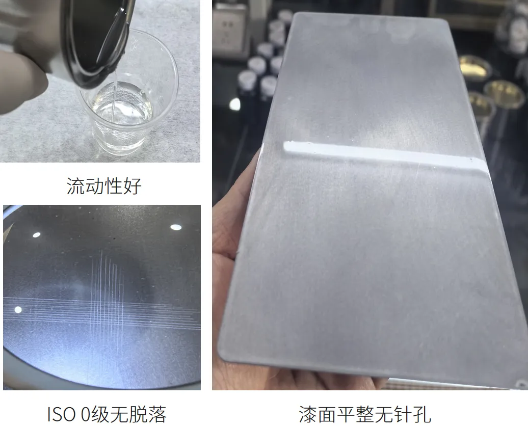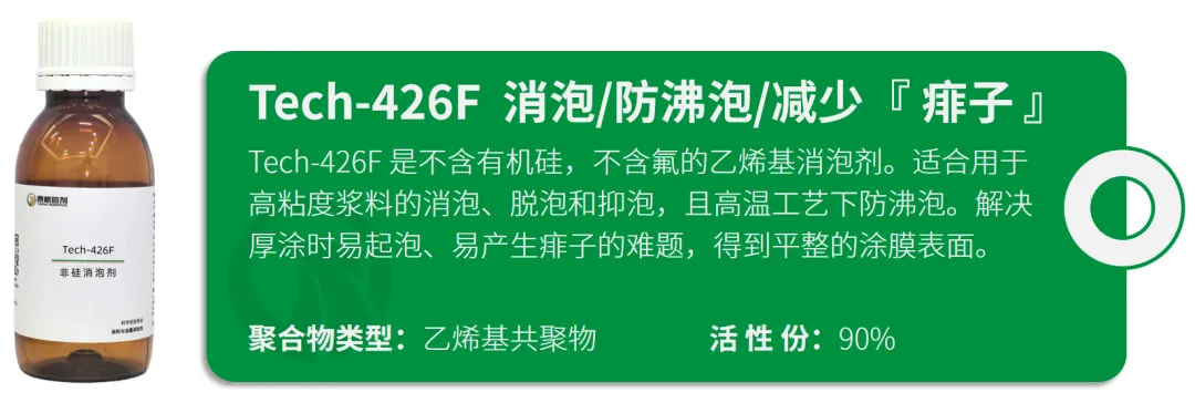 泰格助剂Tech-426F能更好的破坏哑粉导致的气泡液膜,减少稳泡的发生,配合高性能催化剂、附着力促进剂、流平剂,可大幅减少白点,提高哑粉排列性能,并提升涂层机械强度。该方案具有优异的热稳定性。