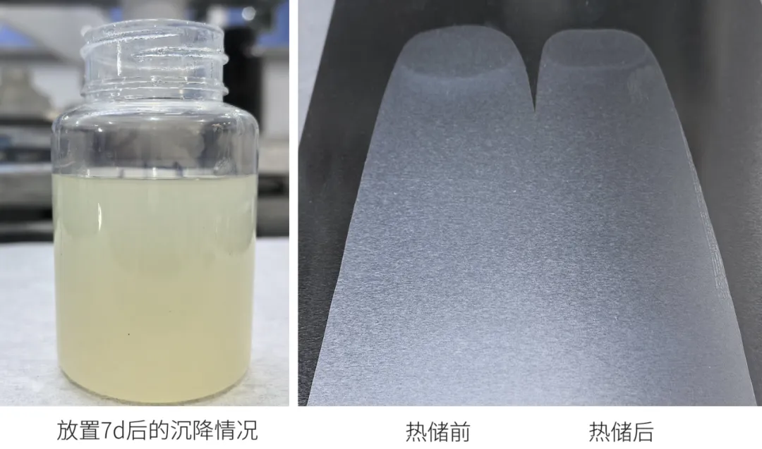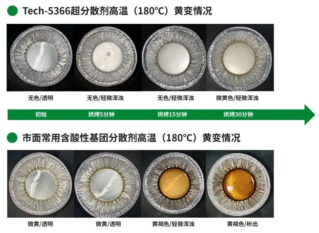 Tech-5366分散剂赋予聚酯白浆『高固低粘』的状态,其空间位阻让热储测试前后粘度、光泽度几乎无变化,热稳定性佳。泰格助剂尽可能避免了因苯环/萘环氧化、不饱和键断裂、含氮基团分解导致的分散剂本身黄变问题。
