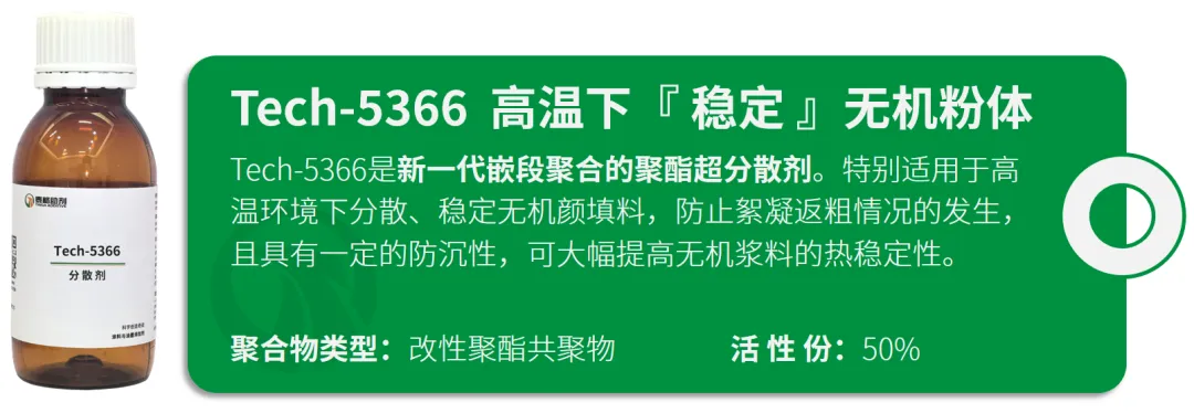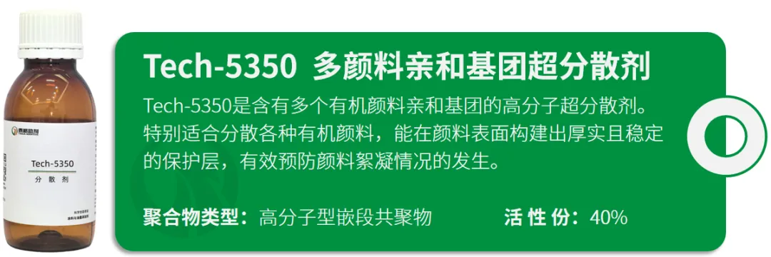 Tech-5366不含PFAS、苯类溶剂及有机锡,其改性聚酯长链能构建更厚的溶剂化层,通过包裹在颜料表面形成空间位阻抵御高温、剪切力及电解质干扰,实现稳定(粘度稳定、光泽度稳定,抗浮色稳定。