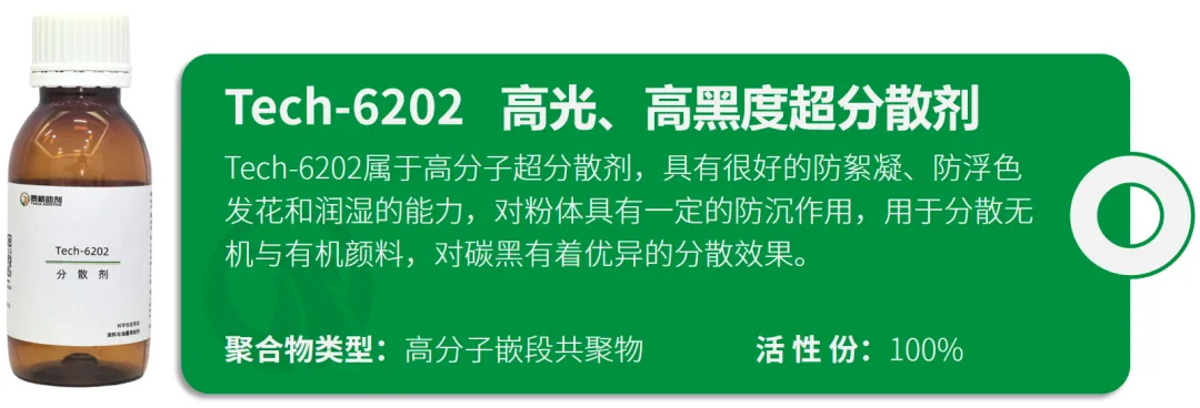 配方实测表明,Tech-6202对表现出优异的黑度、光泽度和热储存稳定性,且展现出很好的抗浮色性能,非常适合对于黑色色浆性能有较高要求的卷材涂料体系。