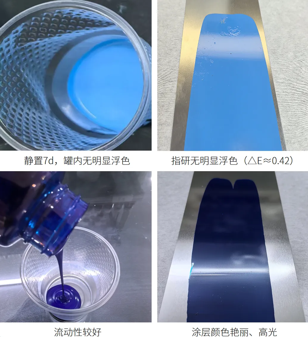 采用Tech-5041超分散剂对酞菁蓝进行稳定,对有效防止颜料絮凝。配方实测表明,热储前后,浆料无失光和明显后增稠情况发生,显示出优异的稳定性。