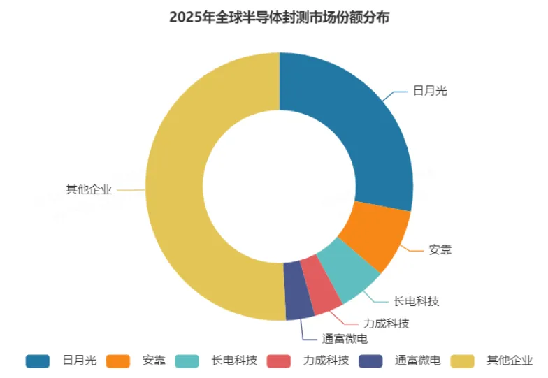 2025年全球半导体封装测试市场规模预计达780-800亿美元,同比增长8-10%,先进封装市场规模达571亿美元(同比增长19%),占比首次超过传统封装(51%)。全球龙头企业竞争格局稳定,技术与产能优势是核心竞争力: