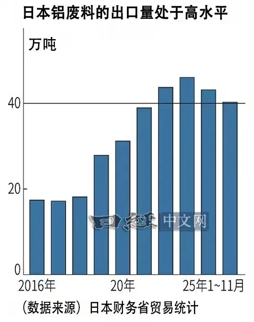 日本财务省的贸易统计显示,1~11月日本铝废料的出口量累计达到40万吨以上,超过上年。2018年之前出口量还不到20万吨,但截至2025年,连续4年超过40万吨。铜废料1~11月也累计同比增长18%。