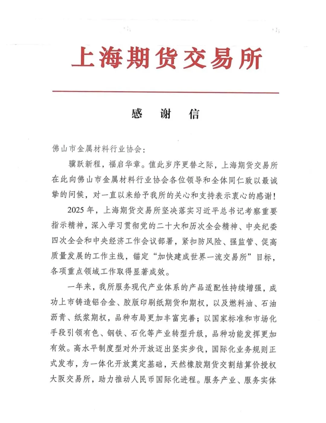 提升 “上海价格”的国际影响力!佛山市金属材料行业协会收到上海期货交易所的感谢信