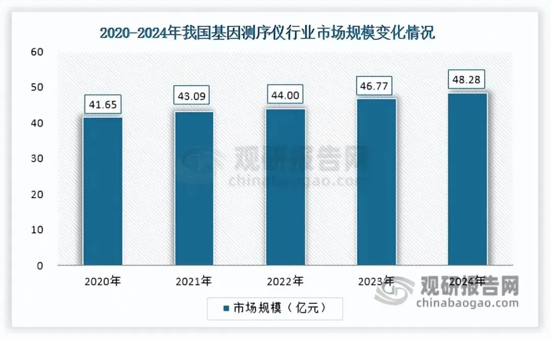 近年来,在利好政策持续护航、基因测序临床应用不断深入,以及测序技术迭代升级、测序成本下降催生下游应用场景不断拓展等多重因素推动下,我国基因测序仪行业发展态势稳健,市场规模从2020年的41.65亿元持续上升至2024年的48.28亿元,年均复合增长率约为3.76%。