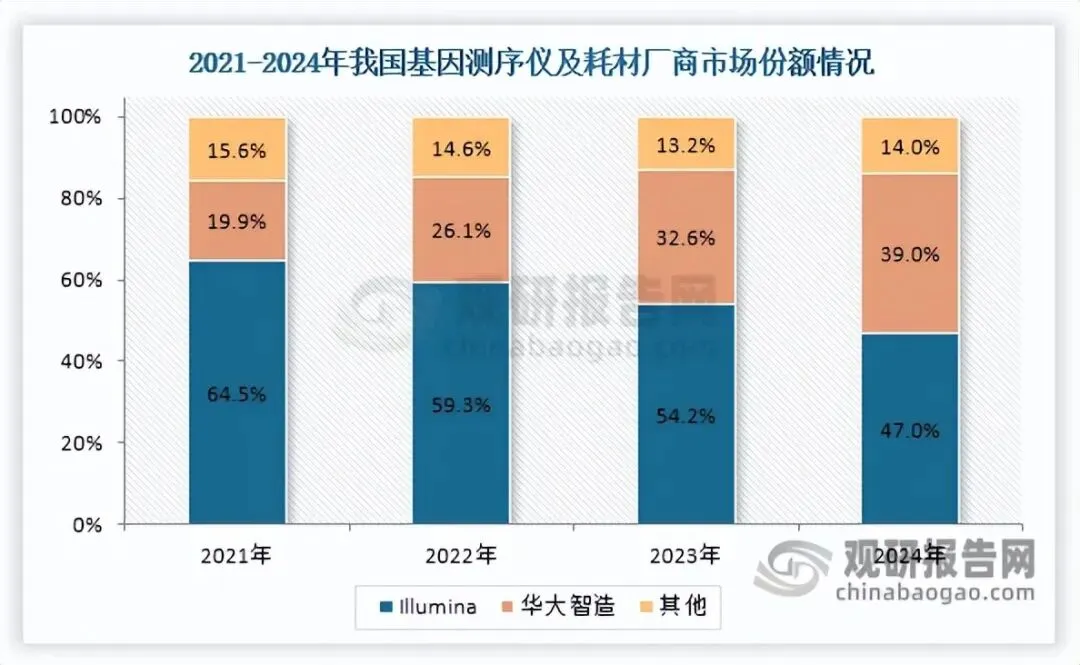 早期,我国基因测序仪行业起步较晚,技术与经验积累薄弱,产品性能与海外龙头存在差距,市场曾长期由Illumina、Thermo Fisher等国际厂商垄断。然而,以华大智造、贝瑞基因等为代表的国产厂商,通过持续的研发投入与技术创新,显著提升了产品性能与可靠性,并凭借本土化服务、高性价比以及对国内应用场景的深度理解等综合优势,成功抢占市场份额,推动国产替代进程不断加速。其中华大智造作为国产阵营领头羊,依托深厚技术积累、丰富的产品矩阵及解决方案,竞争优势不断提升,其在基因测序仪及耗材市场的份额从2021年的19.9%提升至39.0%;同期Illumina的市场份额则由64.5%收缩至47%,国产替代成效显著。