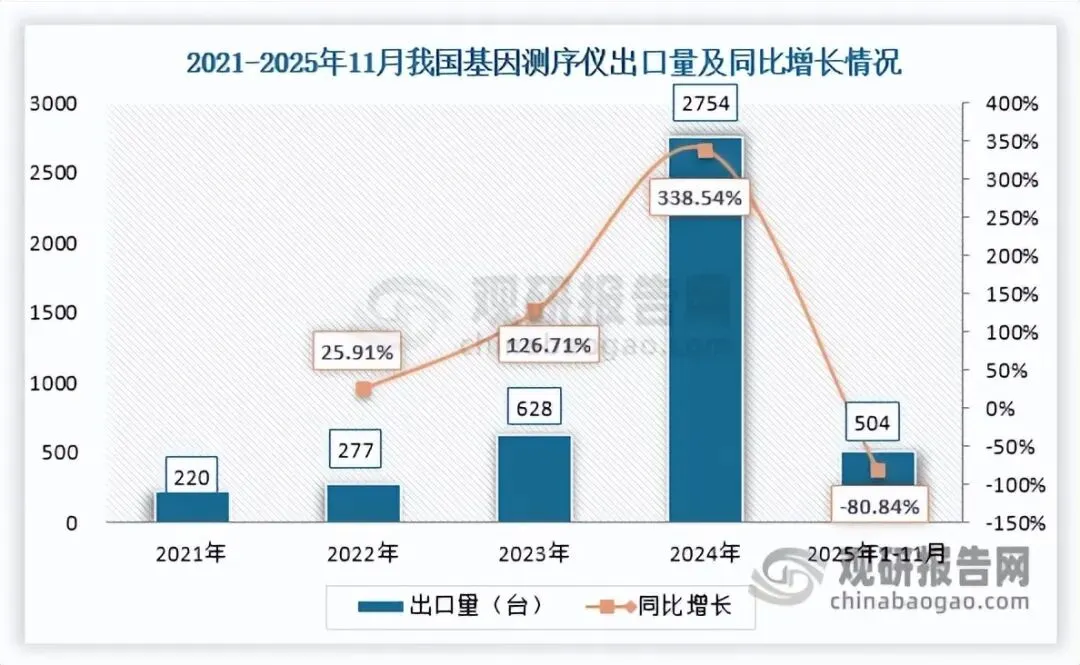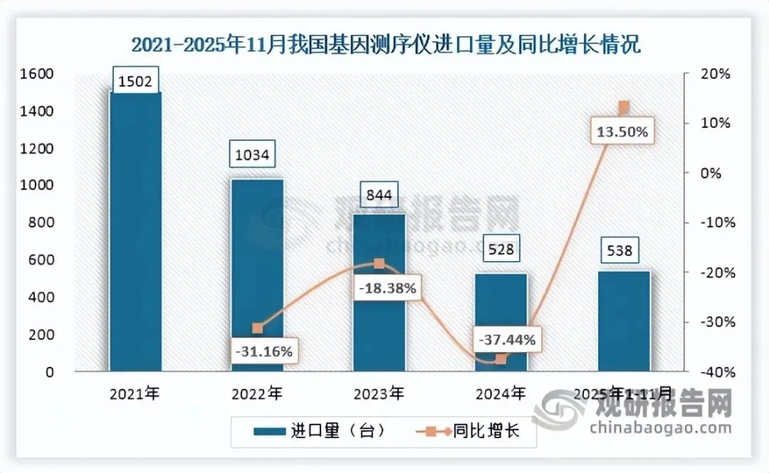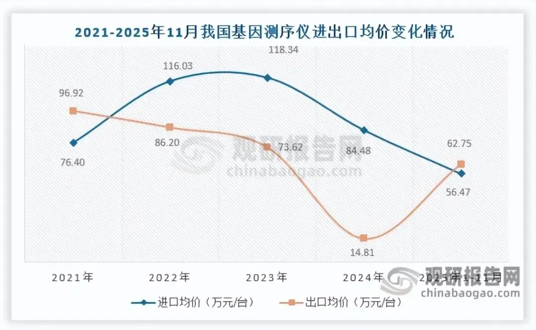 价格方面,自2021年起我国基因测序仪进口均价呈先涨后跌走势,2025年1-11月跌至56.47万元/台,同比下降30.57%;出口均价自2021年起持续下滑,2024年降至14.81万元/台,同比大跌79.88%,而2025年1-11月大幅回升至62.75万元/台,同比激增430.30%,反映出国产产品附加值与定价能力显著提升。
