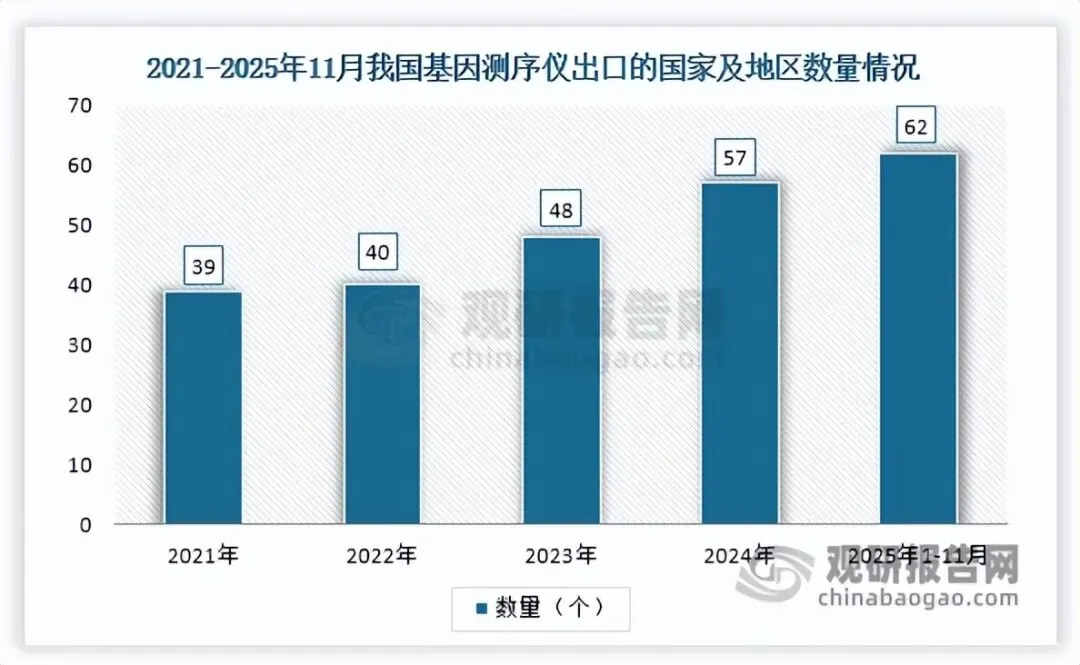 2021-2024年我国基因测序仪进出口走势分化,进口量持续缩减,由1502台降至528台;出口量则快速攀升且增速加快,2024年迎来爆发式增长,达2754台,同比大增338.54%。2025年1-11月走势反转,进口量回升至538台,同比增长13.50%;出口量则受英国等海外市场需求回落、贸易壁垒等因素影响,出现大幅下滑,仅504台,同比下降80.84%。不过,国内基因测序仪企业仍在积极开拓海外市场,出口覆盖范围持续拓宽,2025年1-11月出口至62个国家和地区,较2024年全年增加5个。