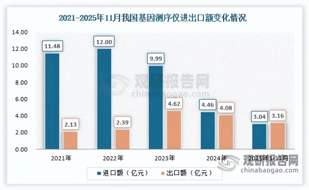 前言:作为临床诊断与生命科学研究不可或缺的基础工具,基因测序仪应用范围广泛。近年来,在多重利好因素推动下,我国基因测序仪行业发展稳健,市场规模稳步扩容。同时行业国产替代进程加速,华大智造作为国产阵营领头羊,竞争优势不断提升,同时积极布局海外取得显著成效。此外,行业进出口走势分化,出口覆盖范围持续拓宽,2025年1-11月贸易差额更是实现由逆转顺。