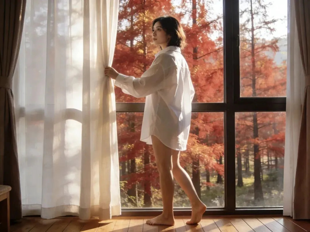 第二天清晨,阳光穿过水杉林,落在民宿的木质地板上。苏野穿着陆沉舟的衬衫,赤脚踩在地板上,走到窗边。