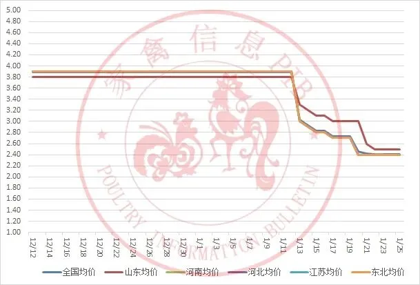 2025年12月12日-2026年1月25日主流地区白羽鸡鸡苗均价走势图