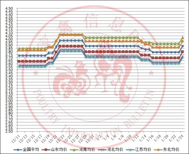 2025年12月11日-2026年1月24日主流地区白羽鸡毛鸡均价走势图