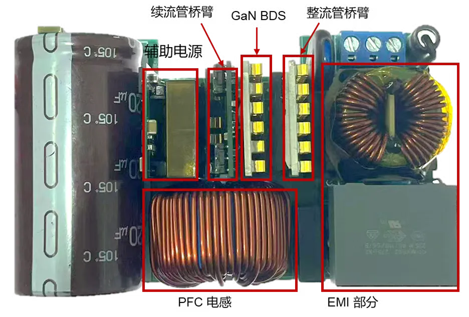 云镓半导体的双向开关前置升压APFC方案,通过基于GaN BDS的创新设计,显著提升了功率因数校正电路的效率与性能。相比传统的Boost型APFC,双向开关前置升压APFC拓扑不仅去除了整流桥的应用,减少了一个整流二极管的损耗,而且在功率器件上采用GaN BDS替代Si SJ-MOS器件,进一步降低了元器件数量和成本,提升了系统的整体效率。GaN BDS不仅具有较高的性能,还可以通过集成单片双向开关,减少了电路面积,降低了系统成本,成为市场上的竞争优势。