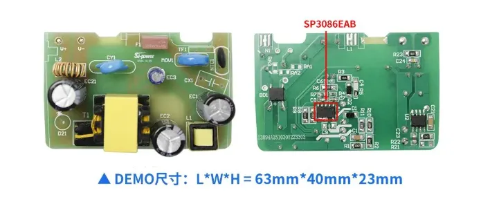 无锡硅动力推出一款基于700V GaN功率器件的SP3086EAB芯片是一款的合封氮化镓芯片,特别适用于设计离线式手机、数码相机充电器及小功率电源适配器等快速充电器和电源供应器方案。其产品特点包括精准的恒压、恒流精度、原边反馈控制、内建自适应峰值电流控制和广泛的保护功能。此外,SP3086EAB还集成高压启动模块,减少了外部组件的需求,待机功耗低于75mW,具备优异的EMI性能和高效率(最高可达90.3%)。适用于85~264V输入电压范围。