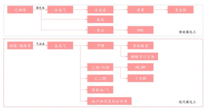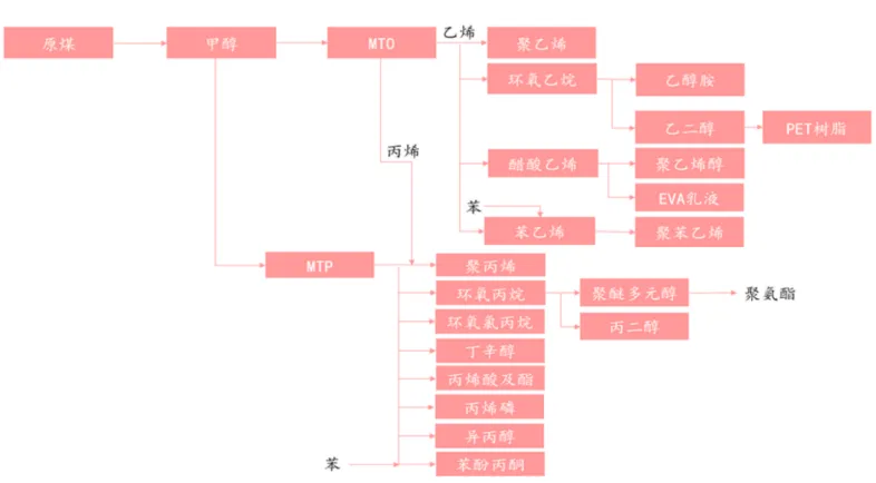 现代煤化工突破了传统煤化工的产品限制,形成了 PE(聚乙烯)、PP(聚丙烯)、乙二醇等大宗品种的产业链。