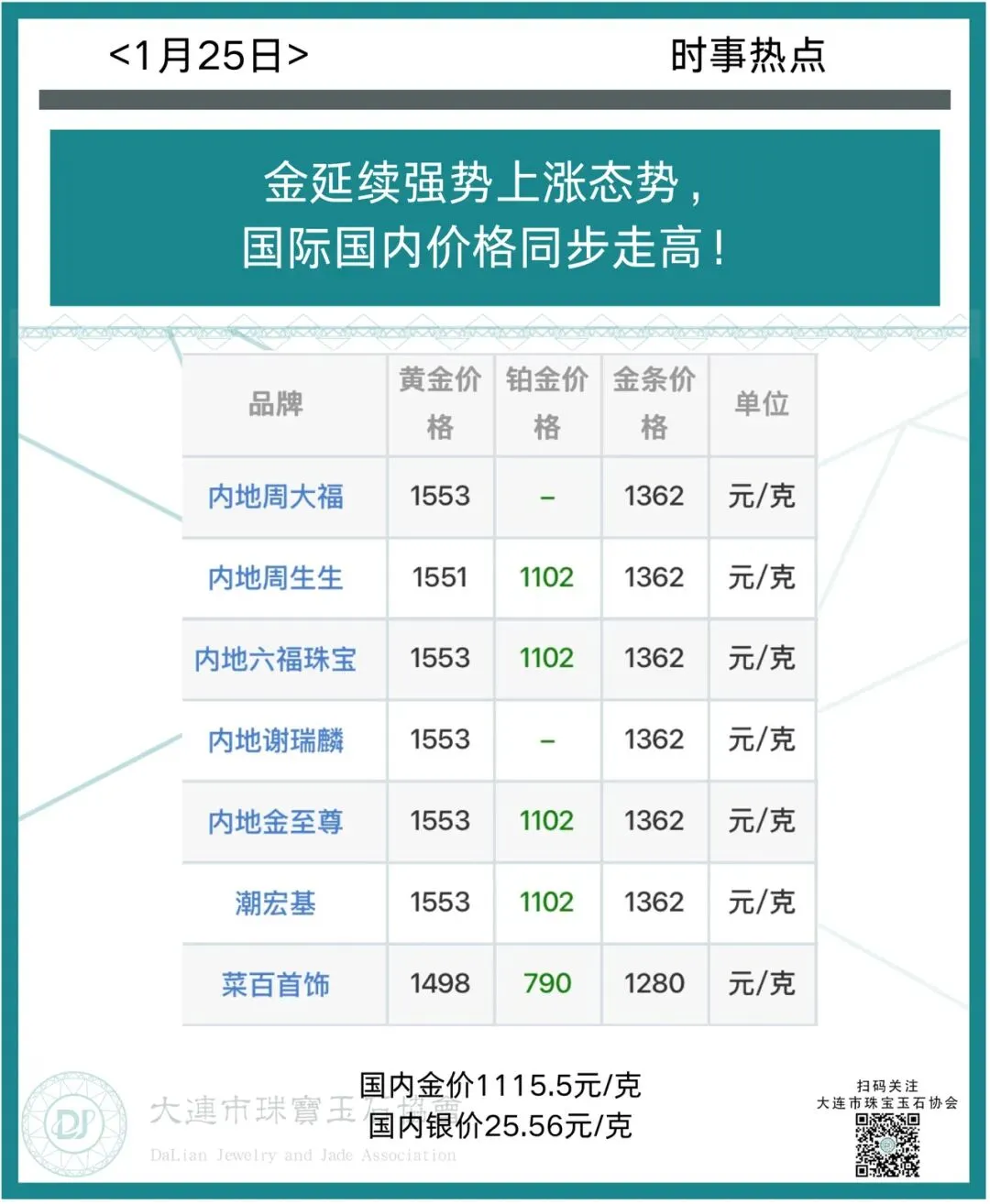 >行业一线资讯 | 1月25日简讯速览:金延续强势上涨态势,国际国内价格同步走高!