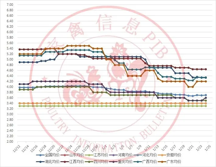 2025年12月12日-2026年1月25日主流地区白羽鸭毛鸭均价走势图