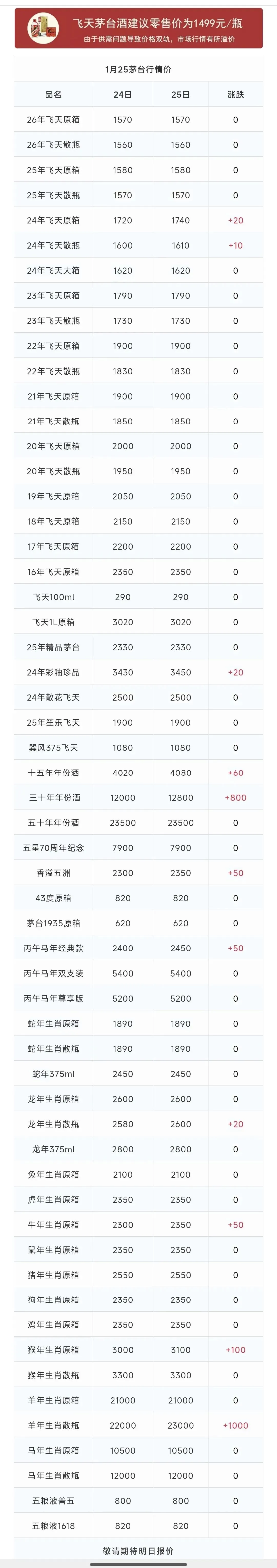 1月25日一线回收参考价和酒商行情价,经典马继续大涨.