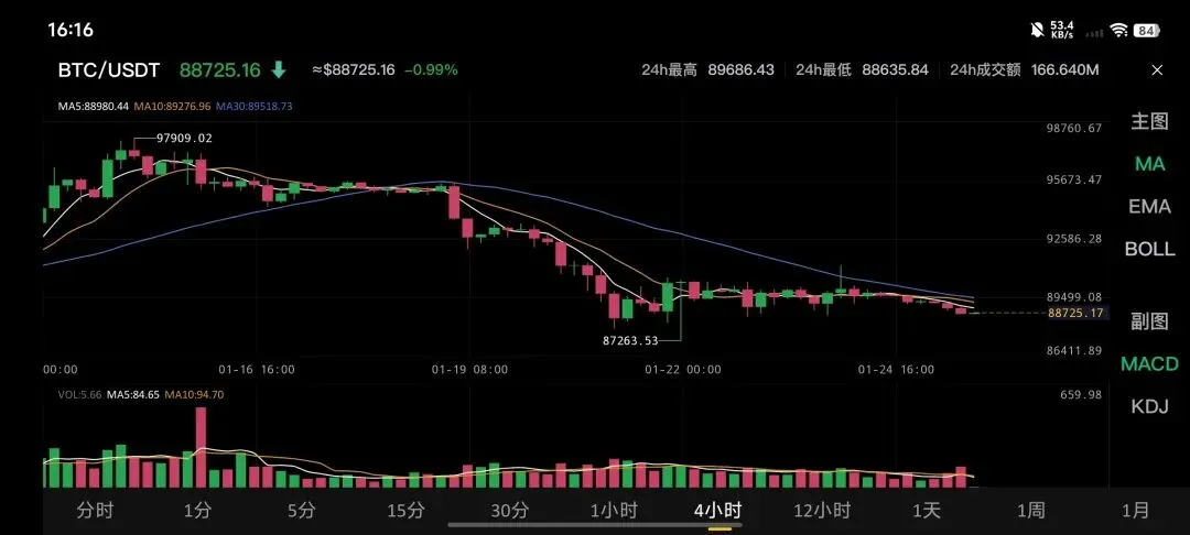 最可能情景:继续在88,000-90,600美元区间震荡整理,等待美联储利率决议(1月28日)和关键经济数据指引。若放量突破90,600美元并站稳,短期目标看92,000美元;若跌破88,000美元支撑,可能下探85,000美元强支撑位。